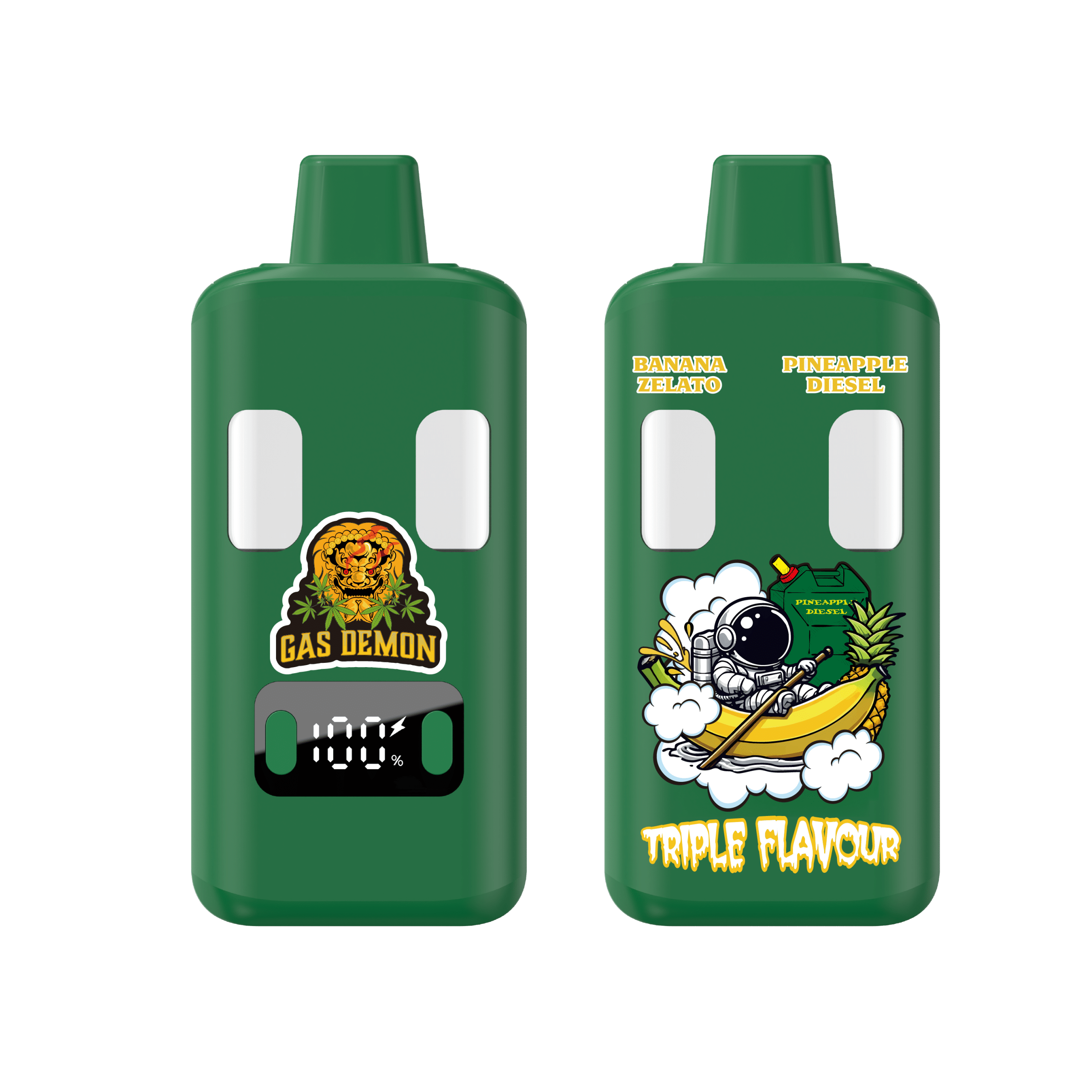 Power up with the Vapes by Gas Demon Dual Flavor Delta-9 THC Vape Pen, loaded with 3g Banana Zelato and 3g Pineapple Diesel. Switch flavors instantly with the quick-slide inhaler, enjoy precision hits with button-activated control, track your battery on the LCD screen, and recharge fast with USB-C. The ultimate vape for flavor lovers and THC enthusiasts.