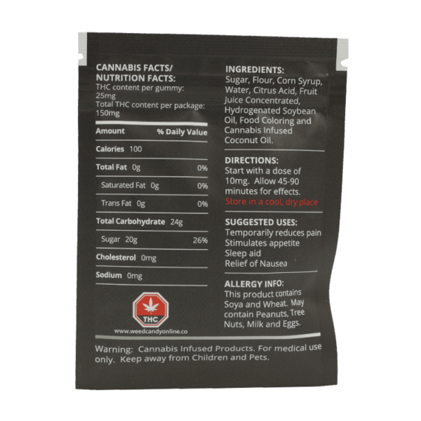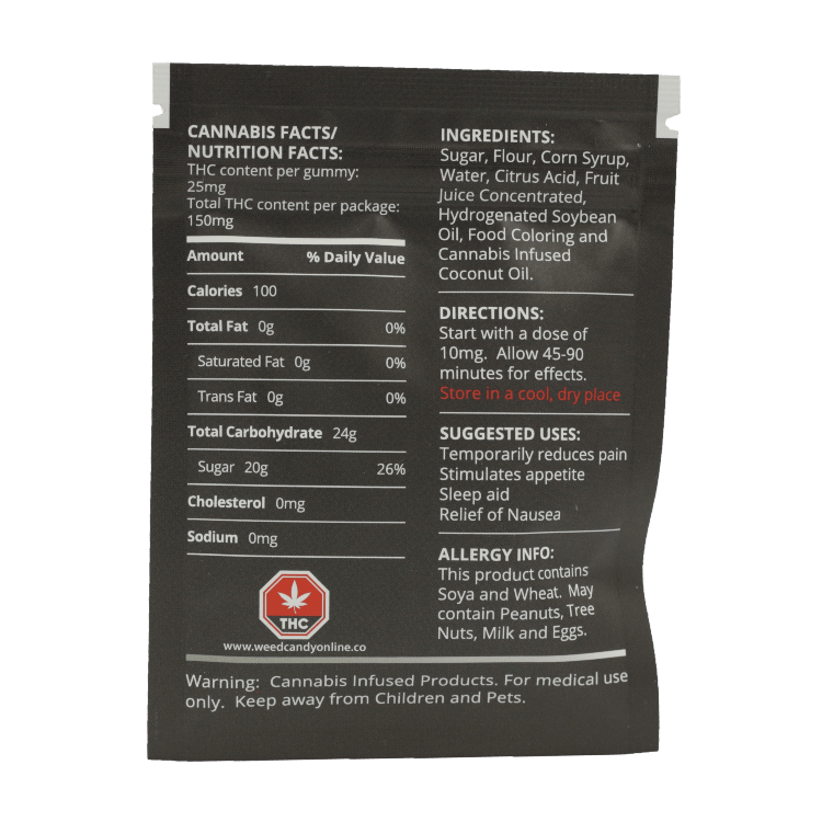DOSAGE:Each Strawberry Ropes is infused with 25mg THC. Begin with one candy and allow half an hour before ingesting more.