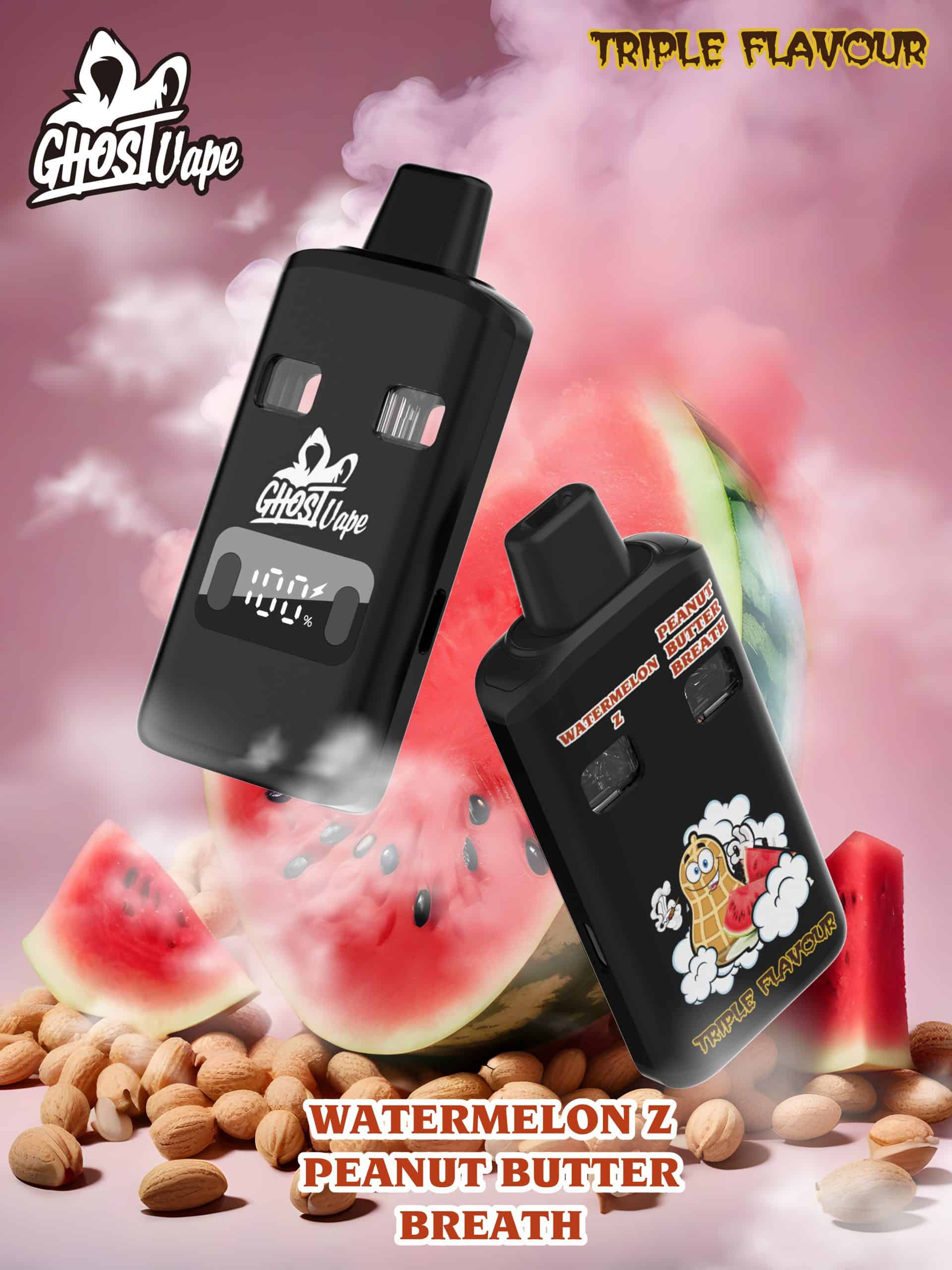 Experience the ultimate flavor fusion with the Watermelon Z x Peanut Butter Breath THC Vape by Ghost Vapes. This premium 2ml vape, packed with 2000mg of potent Delta-9 distillate, features an LCD screen for battery monitoring and the option to switch between two unique flavors—or enjoy them together for a triple-treat experience.
