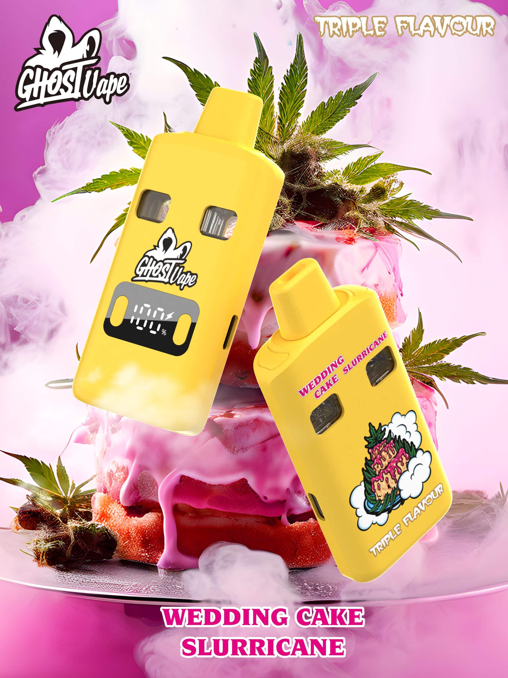 Indulge in the decadent flavors of Wedding Cake x Slurricane THC Vape by Ghost Vapes. This premium 2ml vape features 2000mg of potent Delta-9 distillate, an LCD screen for battery monitoring, and the option to switch between two delicious flavors or enjoy them together for triple the fun.
