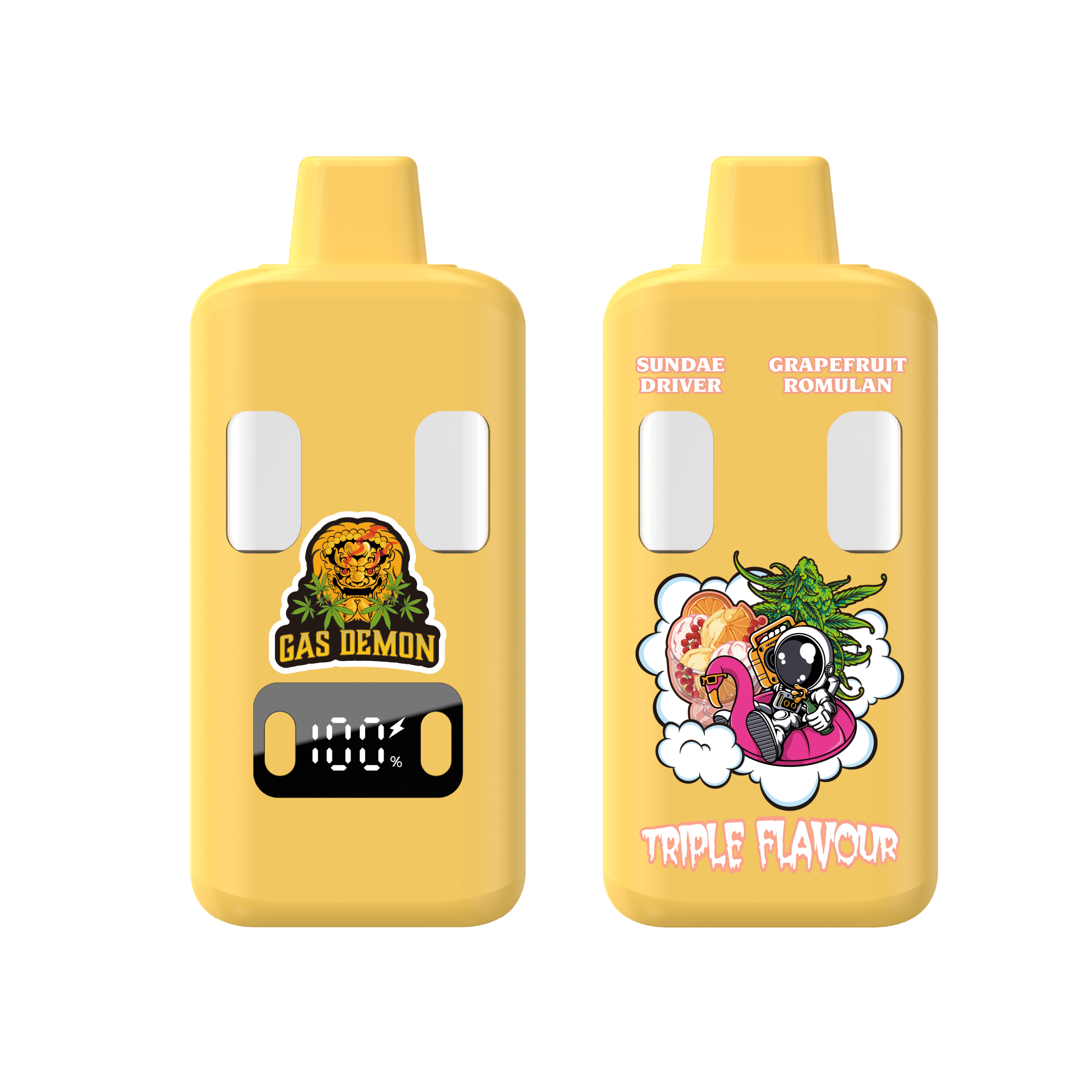 Experience the Vapes by Gas Demon Dual Flavor Delta-9 THC Vape Pen, packed with 3g Sundae Driver and 3g Grapefruit Romulan. Switch flavors instantly with the quick-slide inhaler, enjoy precision pulls with button-activated control, monitor battery life via the LCD display, and recharge quickly with USB-C. Potent, flavorful, and built for true THC enthusiasts.