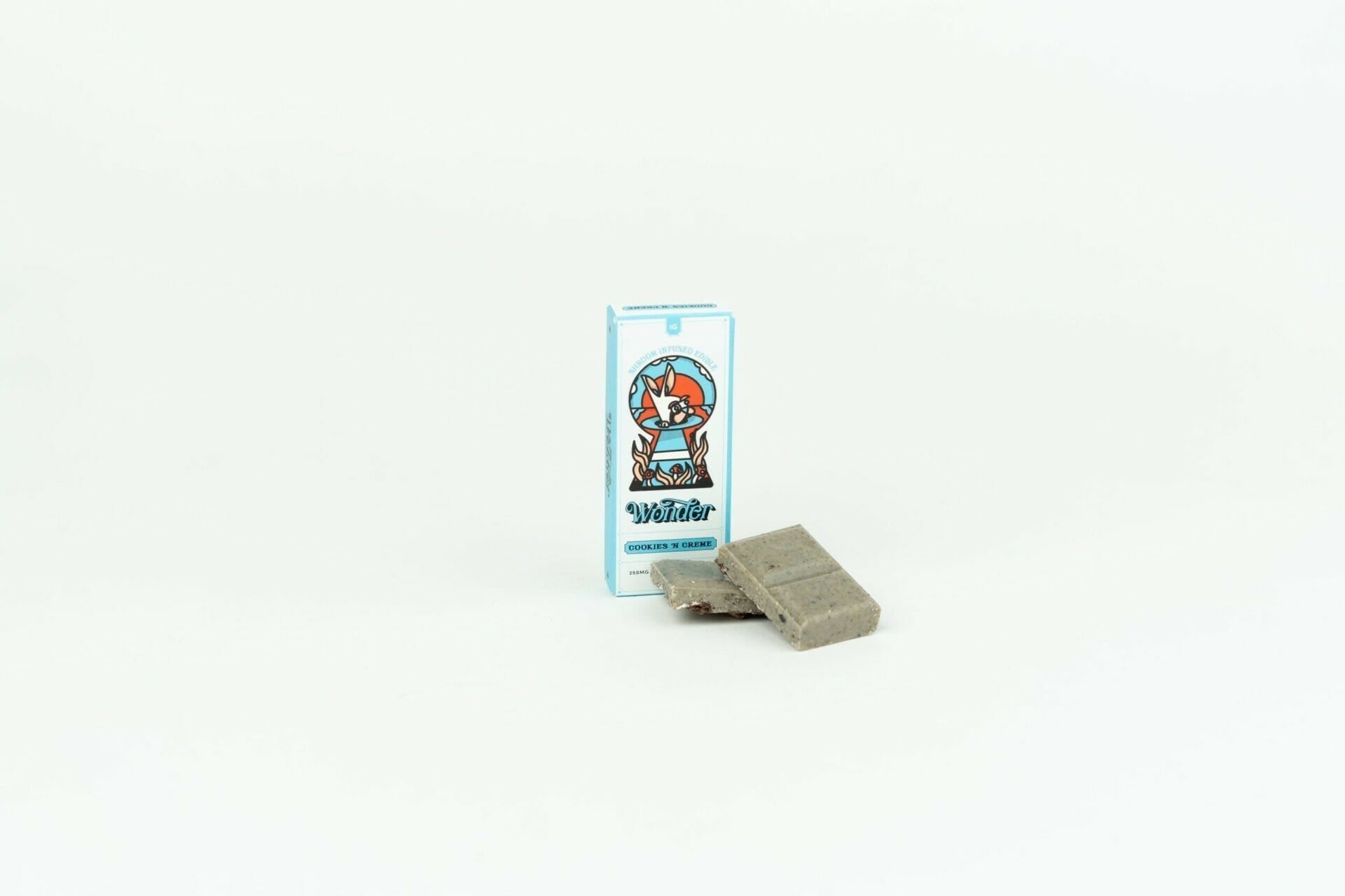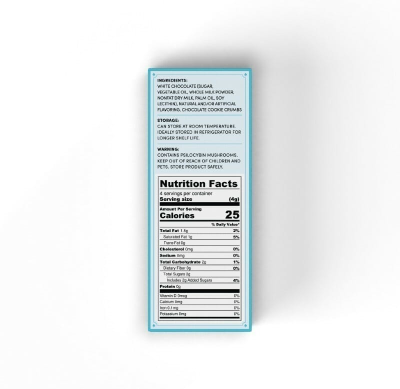 | Ingredients | Psilocybin, white chocolate (sugar, vegetable oil, whole milk powder, nonfat dry milk, palm oil, soy lecithin), natural and/or artificial flavouring, chocolate cookie crumbs. | |